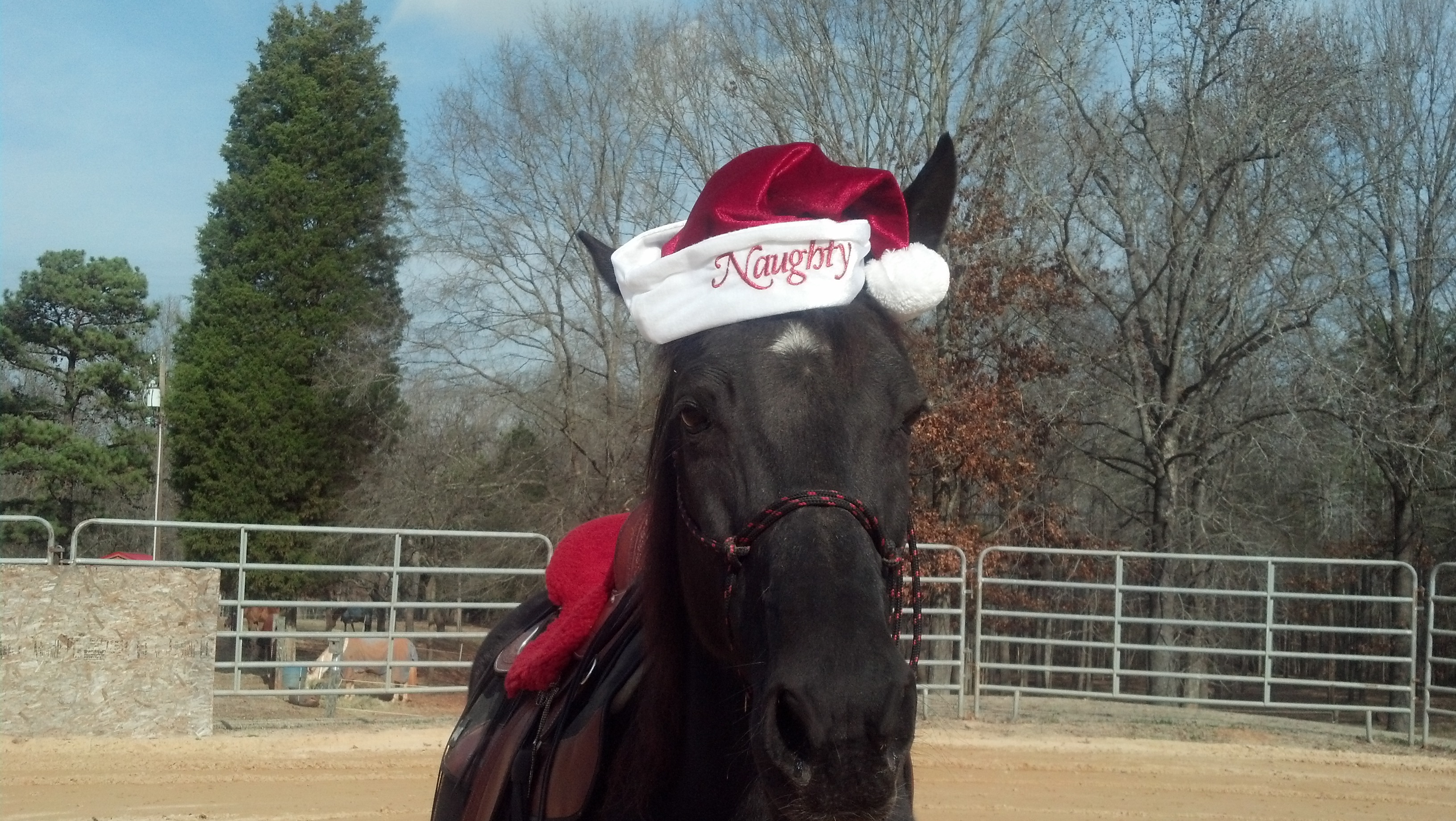 Photo 3: Darcy wearing a Santa hat. The other side says, “Nice.” But for obvious reasons, I posted the “Naughty” one. It suits her. 😀