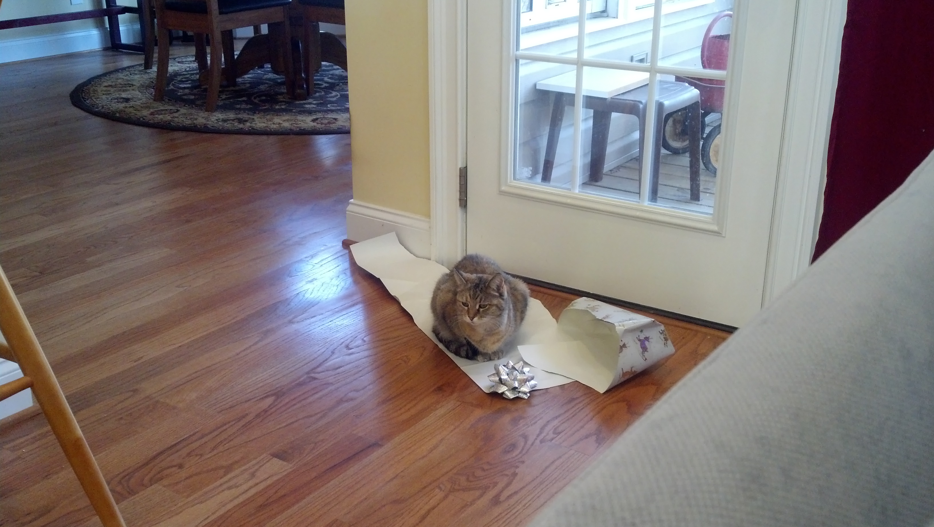 Photo 1: Puttytat is not fond of the chaos of Christmas. She spent most of the morning on this sheet of wrapping paper.