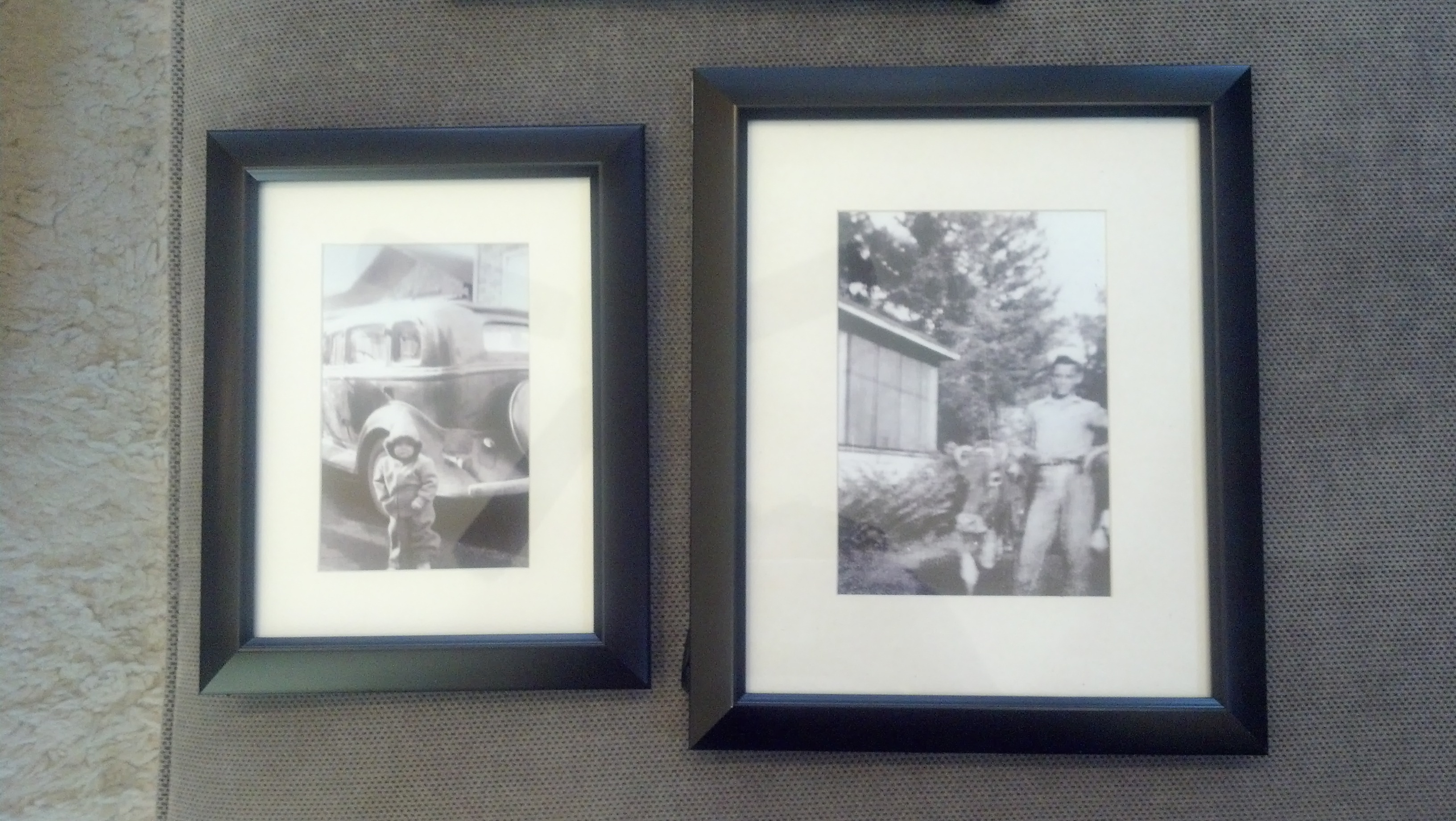 1. I’m working on a photo collage for my stairway and found a box of 9 frames at Lowe’s for $25. Then, I had fun printing out old family photos. On the left is my mother dressed like a conehead. On the right, my father-in-law wearing a sailor hat and standing next to a cow.